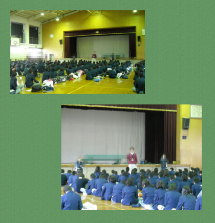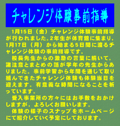 1月15日(金)チャレンジ体験事前指導が行われました。2年生が体育館に集まり,1月17日(月)から始まる5日間に渡るチャレンジ体験の事前指導です。校長先生からの激励の言葉に続いて,諸注意とまとめの話が学年の先生からありました。事前学習から年間を通じて取り組んできたチャレンジ体験も体験当日を迎えます。有意義な時間になることを祈っています。受入事業所の方々にはお手数をおかけしますが,よろしくお願いします。体験の様子のスナップをホームページにて紹介していく予定にしております。