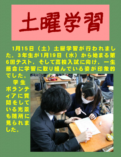 1月15日(土)土曜学習が行われました。3年生が1月19日(水)から始まる第6回テスト,そして高校入試に向け,一生懸命に学習に取り組んでいる姿が印象的でした。学生ボランティアに質問をしている光景も随所に見られました。