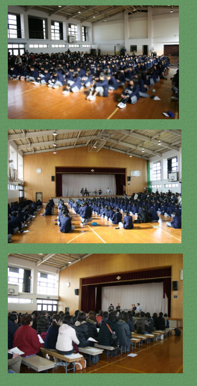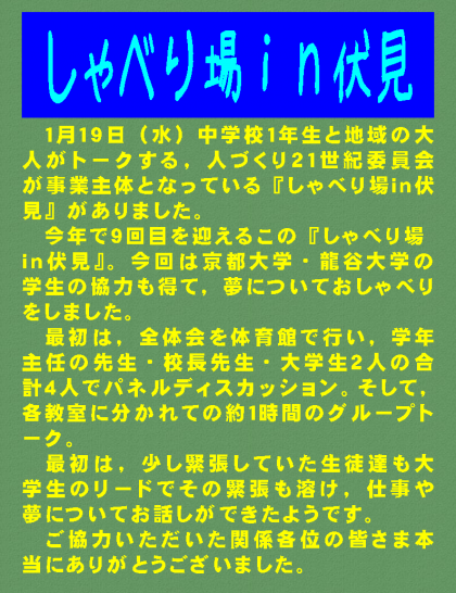 1月19日(水)中学校1年生と地域の大人がトークする,人づくり21世紀委員会が事業主体となっている『しゃべり場in伏見』がありました。今年で9回目を迎えるこの『しゃべり場in伏見』。今回は京都大学・龍谷大学の学生の協力も得て,夢についておしゃべりをしました。最初は,全体会を体育館で行い,学年主任の先生・校長先生・大学生2人の合計4人でパネルディスカッション。そして,各教室に分かれての約1時間のグループトーク。最初は,少し緊張していた生徒達も大学生のリードでその緊張も溶け,仕事や夢についてお話しができたようです。ご協力いただいた関係各位の皆さま本当にありがとうございました。