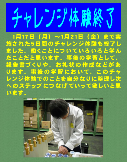 1月17日(月)〜1月21日(金)まで実施された5日間のチャレンジ体験も終了しました。働くことについていろいろと学んだことだと思います。事後の学習として,報告書づくりや,お礼状の作成などがあります。事後の学習において,このチャレンジ体験でのことを自分なりに整理し次へのステップにつなげていって欲しいと思います。