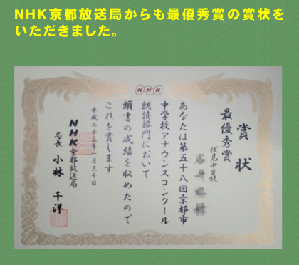 1月30日(日)京都アスニーに於いて『平成22年度 第58回 京都市中学校アナウンスコンクール』が行われました。主催は京都市中学校教育研究会 放送教育部会でNHK京都放送局も後援されています。出場者数は,アナウンス部門34名,朗読部門39名の計73名。伏見中学校では,朗読部門において,2年生のI.Mizuhoさんが最優秀賞に輝きました。同じく朗読部門でT.Yuikoさん(1年生),アナウンス部門でN.Mioriさん(1年生)がともに奨励賞をいただきました。