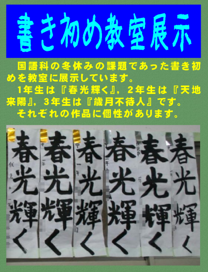 国語科の冬休みの課題であった書き初めを教室に展示しています。1年生は『春光輝く』,2年生は『天地来陽』,3年生は『歳月不待人』です。それぞれの作品に個性があります。