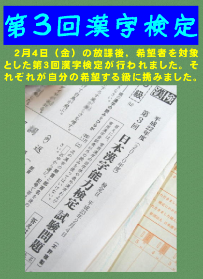 2月4日(金)の放課後,希望者を対象とした第3回漢字検定が行われました。それぞれが自分の希望する級に挑みました。