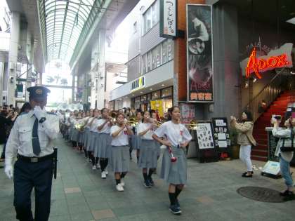 伏見中学校吹奏楽部が経験させていただいている「出会い」。10月20日(土),今日は「365日が笑顔の商店街 大手筋商店街」で行われました「伏見区薬物乱用防止啓発パレード」に参加させていただきました。