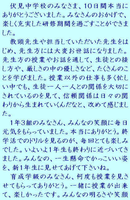 伏見中学校は、あいさつのしっかり出来る生徒が多くて驚きました。なにより、生徒会を中心に一人一人が一生懸命活動する姿を見て、自分ももっと頑張ろう、と勇気づけられました。10日間という短い期間でしたが、伏見中学校で学べて教師になりたい気持ちが強まりました。まだまだ知識も経験も不足していますが、頑張っていきたいと思います。10日間、本当にありがとうございました。