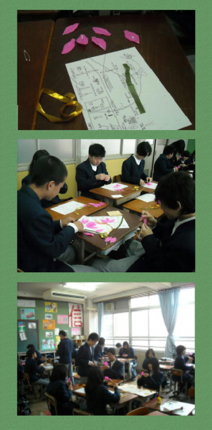 3月8日(火)2年生がコサージュ作りをしました。このコサージュは3年生が卒業式の時にブレザーにつけるものです。数多くの部品を上手に組み合わせてきれいに作りあげてくれました。心のこもったコサージュは卒業式の時に映える事まちがいなし!!