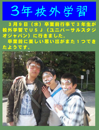 3月9日(水)卒業前行事で3年生が校外学習でUSJ(ユニバーサルスタジオジャパン)に行きました。卒業前に楽しい思い出がまた1つできたようです。