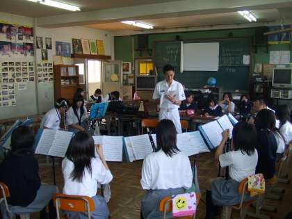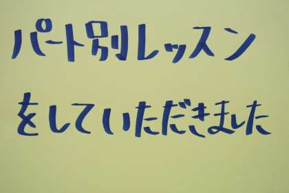 それぞれのパートに分かれてパート別レッスンをしていただきました。生徒に感想を聞くと、『さすがにちがう!!生で聞く音色は深くて迫力がありました。本当に今日は良かったです』と…