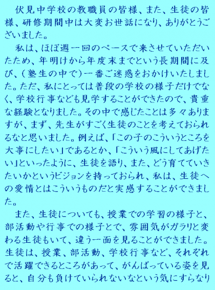今回、このような実地研修の場を提供して下さった伏見中学校の先生方には、授業を見せて頂くなど色々とご迷惑をかけたと思いますが、今回の貴重な経験を生かして先生方のような立派な教師になりたいと思います。本当に10日間、ありがとうございました。