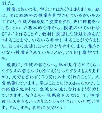 最後に、生徒の皆さんへ。私が見学させてもらったクラスの皆さんは(特によく行ったクラスもありますが)、文句も言わず(?)受け入れてくれたことに、大変感謝しています。学ぶことはたくさんあったので、この経験を生かして、立派な先生になれるよう努力していきます。皆さんも一生懸命を大切にして、中学校生活をおもいっきりエンジョイしてほしいと思います。では、また。本当にありがとう!