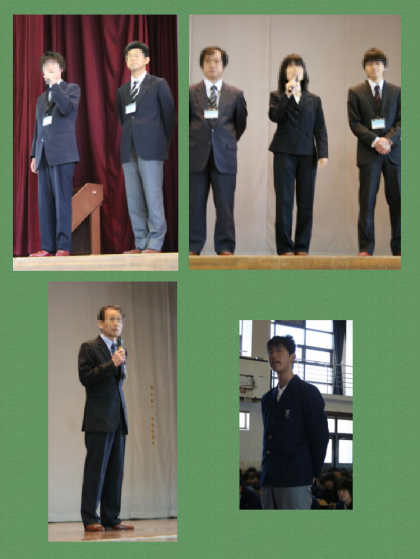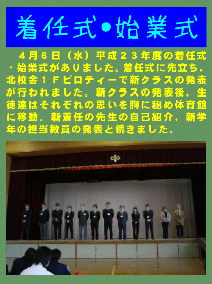 4月6日(水)平成23年度の着任式・始業式がありました。着任式に先立ち,北校舎1Fピロティーで新クラスの発表が行われました。新クラスの発表後,生徒達はそれぞれの思いを胸に秘め体育館に移動。新着任の先生の自己紹介,新学年の担当教員の発表と続きました。