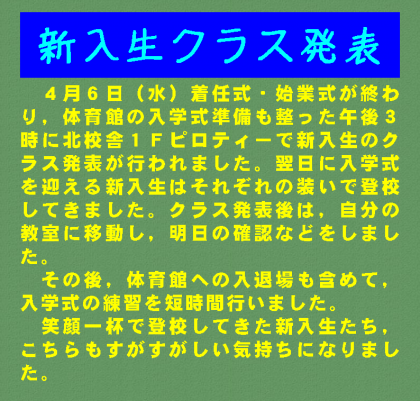 4月6日(水)着任式・始業式が終わり,体育館の入学式準備も整った午後3時に北校舎1Fピロティーで新入生のクラス発表が行われました。翌日に入学式を迎える新入生はそれぞれの装いで登校してきました。クラス発表後は,自分の教室に移動し,明日の確認などをしました。その後,体育館への入退場も含めて,入学式の練習を短時間行いました。