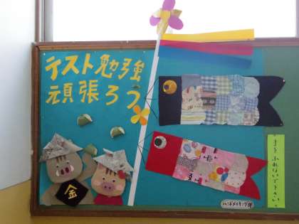こいのぼりと共に、2週間後に控えるテストに向けてのメッセージが添えられています。