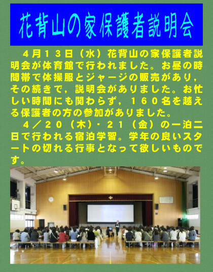 4月13日(水)花背山の家保護者説明会が体育館で行われました。お昼の時間帯で体操服とジャージの販売があり,その続きで,説明会がありました。お忙しい時間にも関わらず,160名を越える保護者の方の参加がありました。4/20(木)・21(金)の一泊二日で行われる宿泊学習。学年の良いスタートの切れる行事となって欲しいものです。
