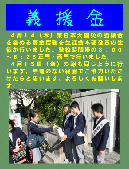 4月14(木)東日本大震災の義援金を集める募金活動を生徒会本部役員の生徒が行いました。登校時間帯の8:00〜8:25正門・西門で行いました。4月15日(金)の朝も同じように行います。無理のない範囲でご協力いただけたらと思います。よろしくお願いします。