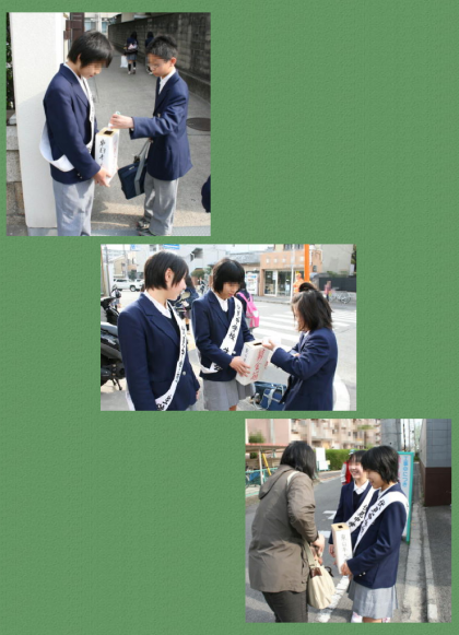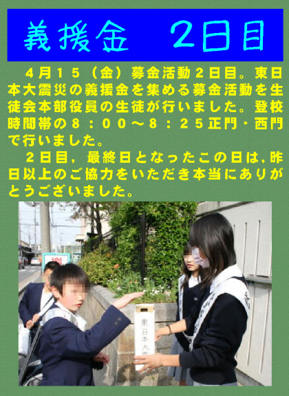 4月15(金)募金活動2日目。東日本大震災の義援金を集める募金活動を生徒会本部役員の生徒が行いました。登校時間帯の8:00〜8:25正門・西門で行いました。2日目,最終日となったこの日は,昨日以上のご協力をいただき本当にありがとうございました。