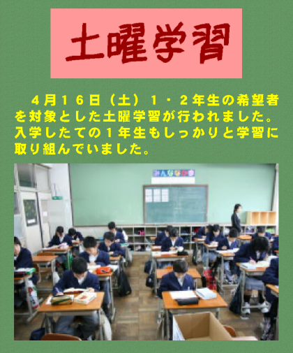 4月16日(土)1・2年生の希望者を対象とした土曜学習が行われました。入学したての1年生もしっかりと学習に取り組んでいました。