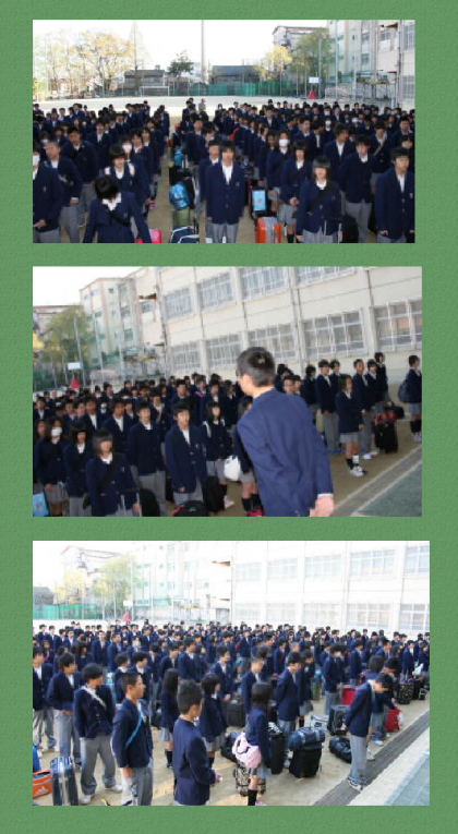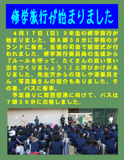 4月17日(日)3年生の修学旅行が始まりました。朝6時30分に学校のグランドに集合。生徒の司会で結団式が行われました。修学旅行委員長の生徒から『ルールを守って,たくさんの良い思い出をつくりましょう!』と呼びかけがありました。先生方からの話しや添乗員さん・写真屋さんの紹介もありました。その後,バスに乗車。予定通りに関西空港に向けて,バスは7時30分に出発しました