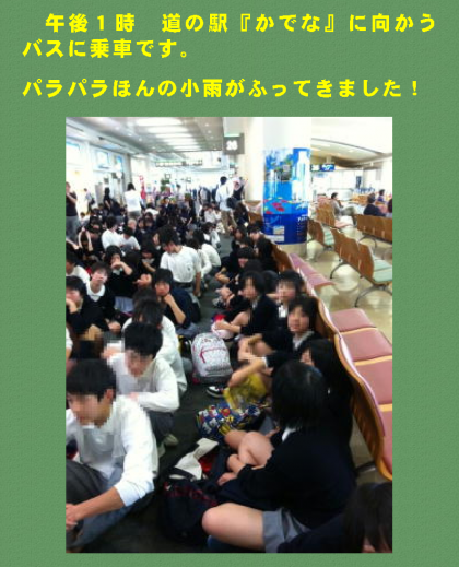 午後1時 道の駅『かでな』に向かうバスに乗車です。小雨がパラパラ降ってきました
