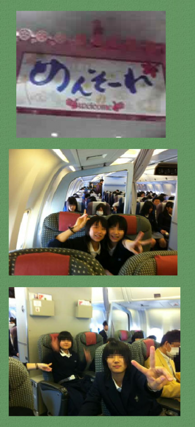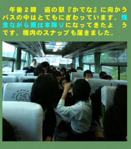 午後2時 道の駅『かでな』に向かうバスの中はとてもにぎわっています。残念ながら雨は本降りになってきたようです。機内のスナップも届きました
