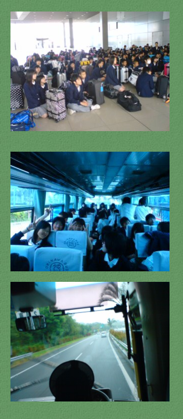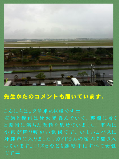 空港と機内は皆大変喜んでいて,那覇に着くと期待に満ちた表情を見せていました。市内は小雨が降り暖かい気候です。いよいよバスは沖縄市に入りました。ガイドさんの案内を聞き入っています。バス5台とも運転手はすべて女性です