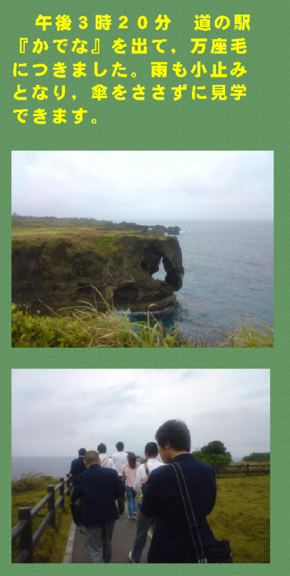 午後3時20分 道の駅『かでな』を出て,万座毛につきました。雨も小止みとなり,傘をささずに見学できます