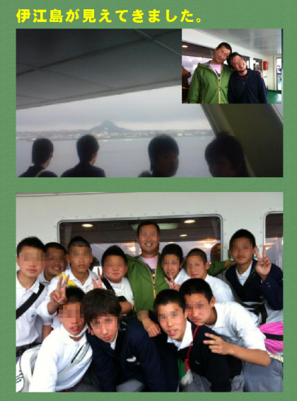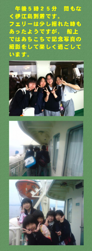 午後5時25分 間もなく伊江島到着です。フェリーは少し揺れた時もあったようですが, 船上ではあちこちで記念写真の撮影をして楽しく過ごしています