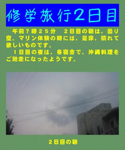 午前7時25分 2日目の朝は,曇り空。マリン体験の時には,是非,晴れて欲しいものです。1日目の夜は,各宿舎で,沖縄料理をご馳走になったようです