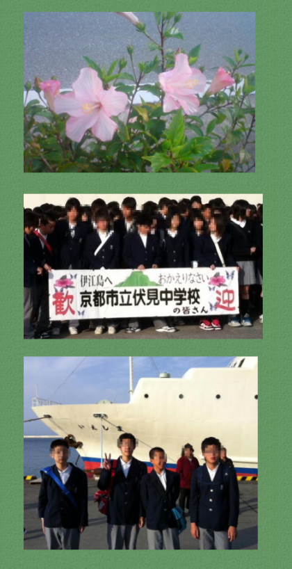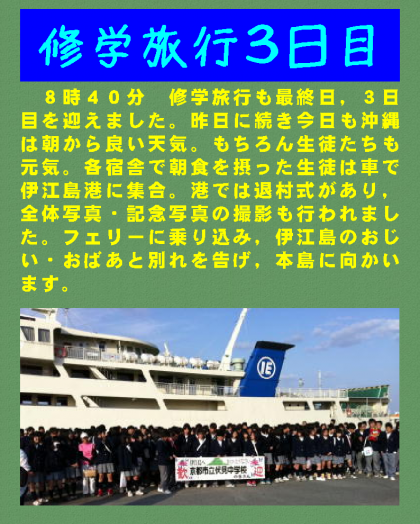 8時40分 修学旅行も最終日,3日目を迎えました。昨日に続き今日も沖縄は朝から良い天気。もちろん生徒たちも元気。各宿舎で朝食を摂った生徒は車で伊江島港に集合。港では退村式があり,全体写真・記念写真の撮影も行われました。フェリーに乗り込み,伊江島のおじい・おばあと別れを告げ,本島に向かいます!