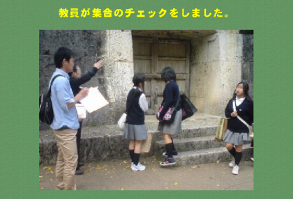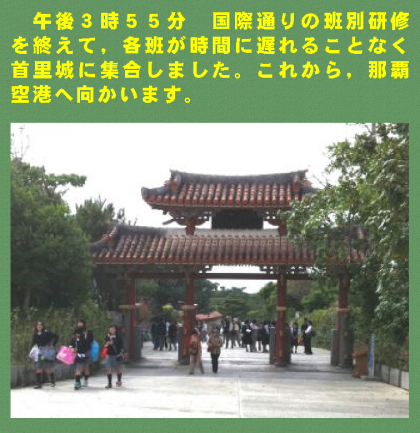 午後3時55分 国際通りの班別研修を終えて,各班が時間に遅れることなく首里城に集合しました。教員が集合のチェックをしました!
