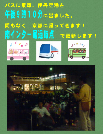 午後9時10分伊丹空港を出発。バスに乗車,間もな 京都に帰ってきます!南インター通過時点 で更新します!!
