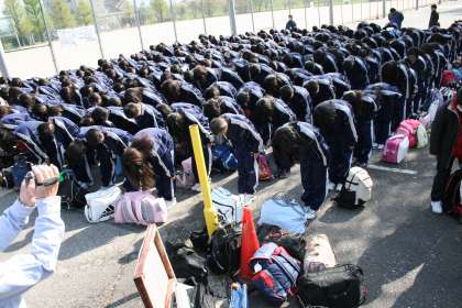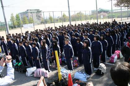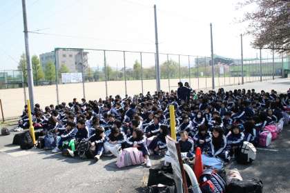 花背山の家の宿泊学習が始まりました。天気もバッチりです。朝の集合もみな元気に集まり,予定通り出発。10時50分に山の家に到着しました。11時から本館前で入所式が行われました。実行委員の生徒の司会と挨拶も立派に堂々と行われました。持参したお弁当をクラスごとに食べたあとは,野外炊飯です。