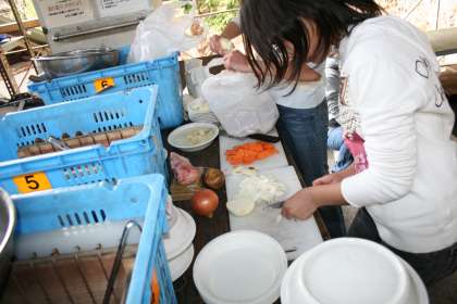 夕ご飯つくりが始まっています。カレーやシチュー,豚汁とメニューもいろいろです。各班協力しています。おいしい夕ご飯ができそうです。