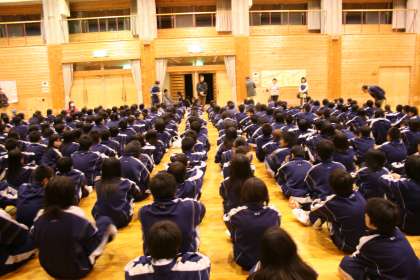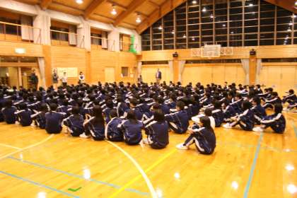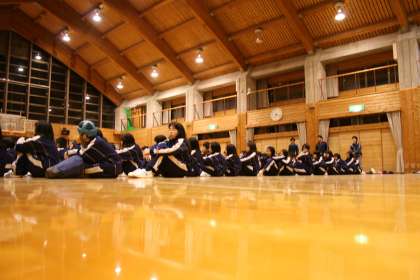 入浴後,プレイホールで学年レクレーションが始まりました。生徒の司会進行で『船長さんの命令ゲーム』,『伝言ゲーム』などが行われました。あと『イントロ当てクイズ』『大縄跳び大会』などもあります。学年レクレーションを終えて本日の活動も終了。午後10時消灯となります