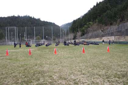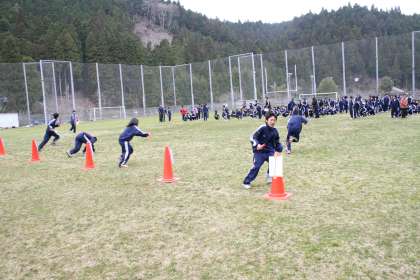 グランドで学級対抗スポーツ大会が始まりました。全員リレーやドッジボール,グランドのカーリングのようなペタンクをしています。学級対抗スポーツ大会終了後は,昼食を摂り,退所式となります。