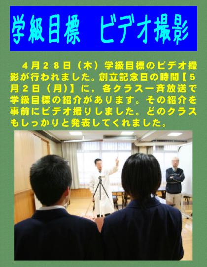 4月28日(木)学級目標のビデオ撮影が行われました。創立記念日の時間【5月2日(月)】に,各クラス一斉放送で学級目標の紹介があります。その紹介を事前にビデオ撮りしました。どのクラスもしっかりと発表してくれました。