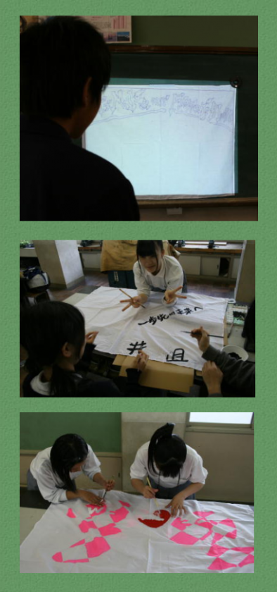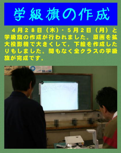 4月28日(木)・5月2日(月)と学級旗の作成が行われました。原画を拡大投影機で大きくして,下絵を作成したりもしました。間もなく全クラスの学級旗が完成です。
