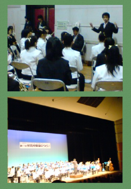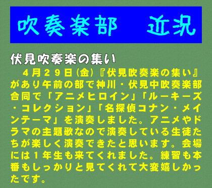 4月29日(金)『伏見吹奏楽の集い』があり午前の部で神川・伏見中吹奏楽部合同で「アニメヒロイン」「ルーキーズ・コレクション」「名探偵コナン・メインテーマ」を演奏しました。アニメやドラマの主題歌なので演奏している生徒たちが楽しく演奏できたと思います。会場には1年生も来てくれました。練習も本番もしっかりと見てくれて大変嬉しかったです。