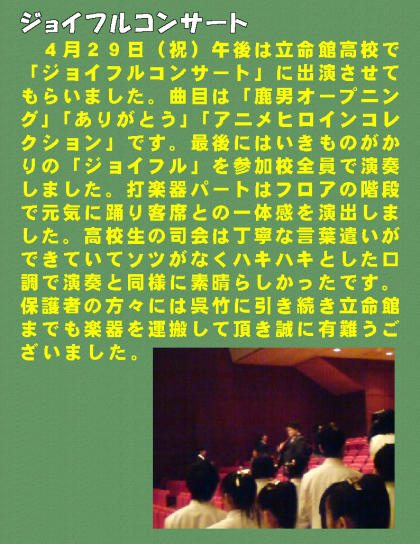4月29日(祝)午後は立命館高校で「ジョイフルコンサート」に出演させてもらいました。曲目は「鹿男オープニング」「ありがとう」「アニメヒロインコレクション」です。最後にはいきものがかりの「ジョイフル」を参加校全員で演奏しました。打楽器パートはフロアの階段で元気に踊り客席との一体感を演出しました。高校生の司会は丁寧な言葉遣いができていてソツがなくハキハキとした口調で演奏と同様に素晴らしかったです。保護者の方々には呉竹に引き続き立命館までも楽器を運搬して頂き誠に有難うございました。