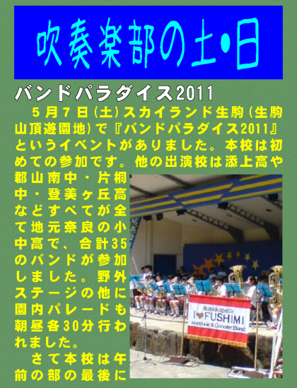 5月7日(土)スカイランド生駒(生駒山頂遊園地)で『バンドパラダイス2011』というイベントがありました。本校は初めての参加です。他の出演校は添上高や郡山南中・片桐中・登美ヶ丘高などすべてが全て地元奈良の小中高で、合計35のバンドが参加しました。野外ステージの他に園内パレードも朝昼各30分行われました。