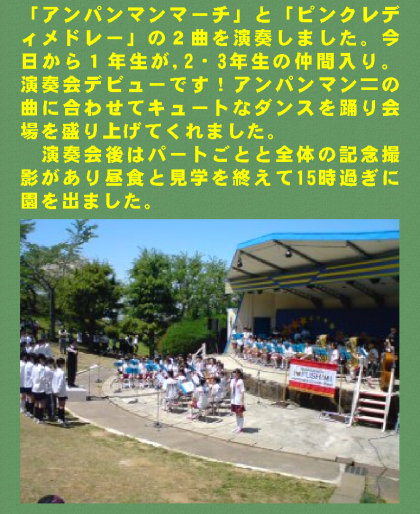 さて本校は午前の部の最後に「アンパンマンマーチ」と「ピンクレディメドレー」の2曲を演奏しました。今日から1年生が,2・3年生の仲間入り。演奏会デビューです!アンパンマン〓の曲に合わせてキュートなダンスを踊り会場を盛り上げてくれました。