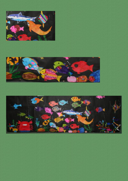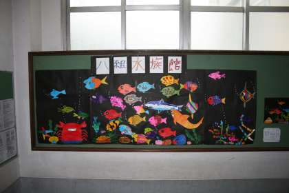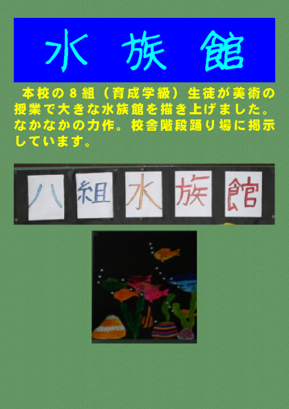 本校の8組(育成学級)生徒が美術の授業で大きな水族館を描き上げました。なかなかの力作。校舎階段踊り場に掲示しています。