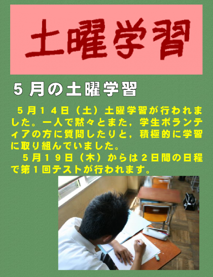5月14日(土)土曜学習が行われました。一人で黙々とまた,学生ボランティアの方に質問したりと,積極的に学習に取り組んでいました。5月19日(木)からは2日間の日程で第1回テストが行われます。