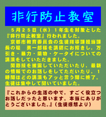5月25日(水)1年生を対象とした『非行防止教室』行われました。京都市教育委員会の生徒指導課担当課長の堤 勇一郎様を講師にお招きし,万引き・暴力・薬物・ケータイについての講演をしていただきました。1時間ほどの講演もアッと言う間に終了。関節技を披露していただいたり,最新の情報でのお話しをしてただいたり,生徒は集中して聞いていました。