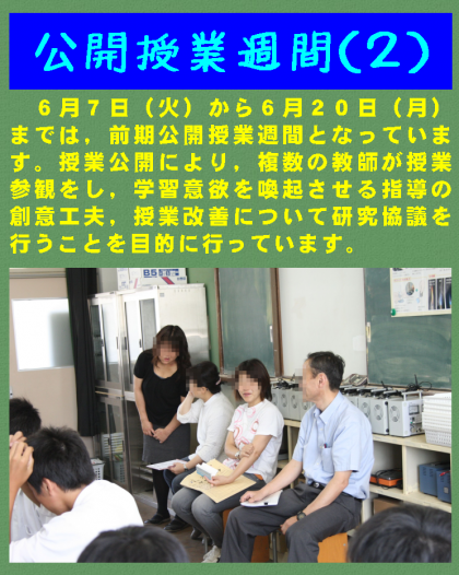 6月7日(火)から6月20日(月)までは,前期公開授業週間となっています。授業公開により,複数の教師が授業参観をし,学習意欲を喚起させる指導の創意工夫,授業改善について研究協議を行うことを目的に行っています。
