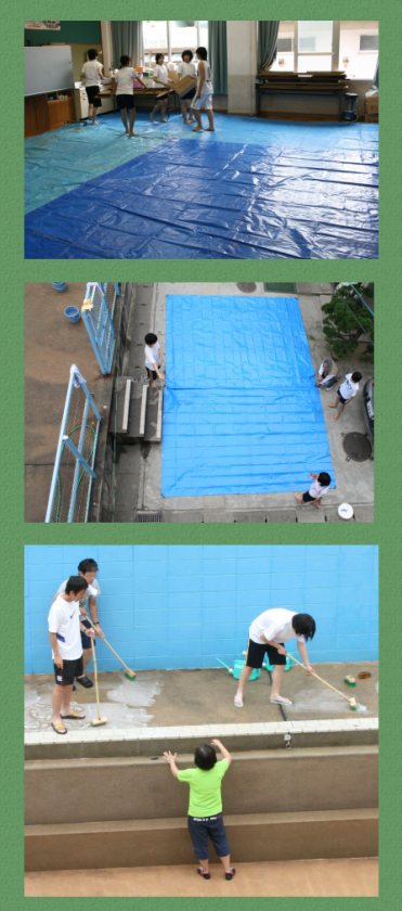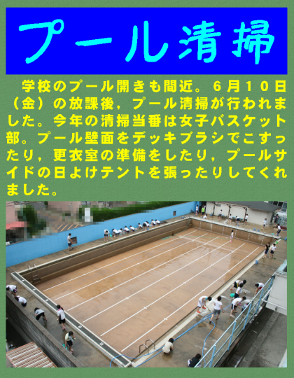 学校のプール開きも間近。6月10日(金)の放課後,プール清掃が行われました。今年の清掃当番は女子バスケット部。プール壁面をデッキブラシでこすったり,更衣室の準備をしたり,プールサイドの日よけテントを張ったりしてくれました。