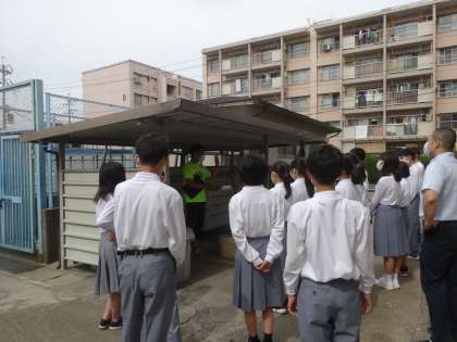 校舎めぐりでは,特別教室と給湯室やゴミ捨て場の使い方を確認をしました。職員室前では,入室の方法も練習しました。