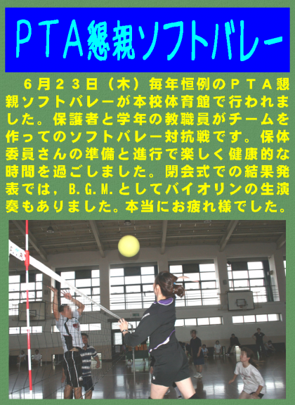 6月23日(木)毎年恒例のPTA懇親ソフトバレーが本校体育館で行われました。保護者と学年の教職員がチームを作ってのソフトバレー対抗戦です。保体委員さんの準備と進行で楽しく健康的な時間を過ごしました。閉会式での結果発表では,B.G.M.としてバイオリンの生演奏もありました。本当にお疲れ様でした。