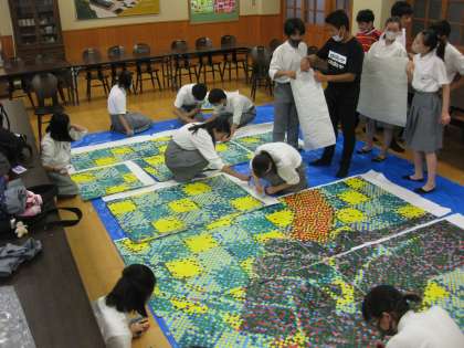 9月3日(木)「大壁画」の製作を行いました。原画をもとに各クラスごとに製作されたピースを一堂に集め、生徒会本部が中心となって一つにしていきました。