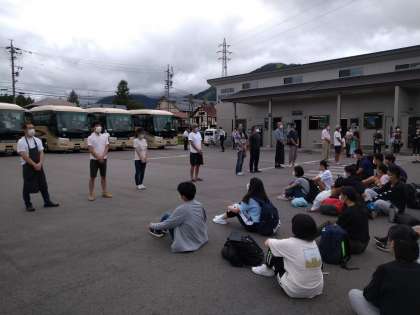 お世話になったペンションを離れて,この後バスで体験活動に出発します。